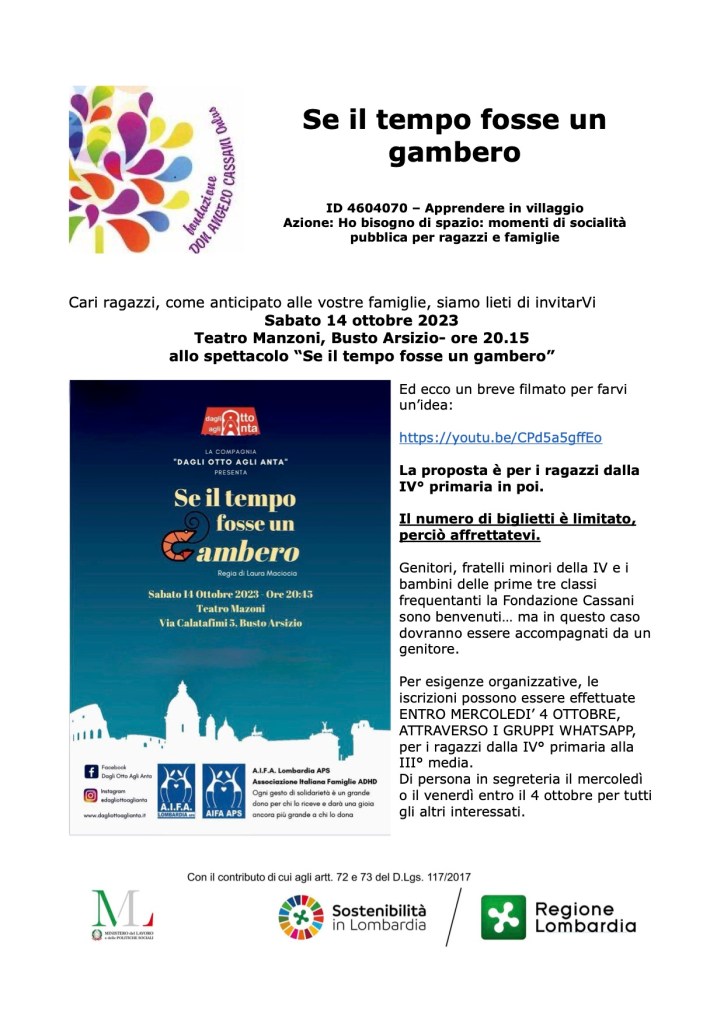 Proposta di spettacolo teatrale “Se il tempo fosse un gambero” 14 Ottobre -ore 20.15 – Teatro Manzoni – Busto Arsizio Pubblicato daweissewand24 settembre 2023Pubblicato in: News, Spazio CompitiTag:Busto Arsizio, Se il tempo fosse un gambero, Teatro Manzoni https://youtu.be/CPd5a5gffEo spettacolo-teatrale-14-ottobre-2023-aifa-locandina-1Download Condividi: Fai clic per inviare un link a un amico via e-mail (Si apre in una nuova finestra) E-mail Fai clic qui per stampare (Si apre in una nuova finestra) Stampa Mi piace Caricamento... Correlati
